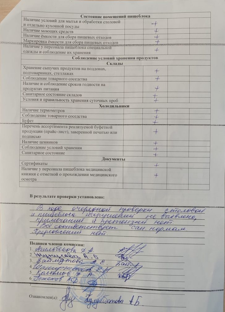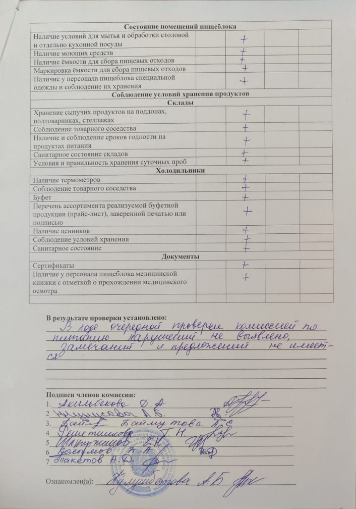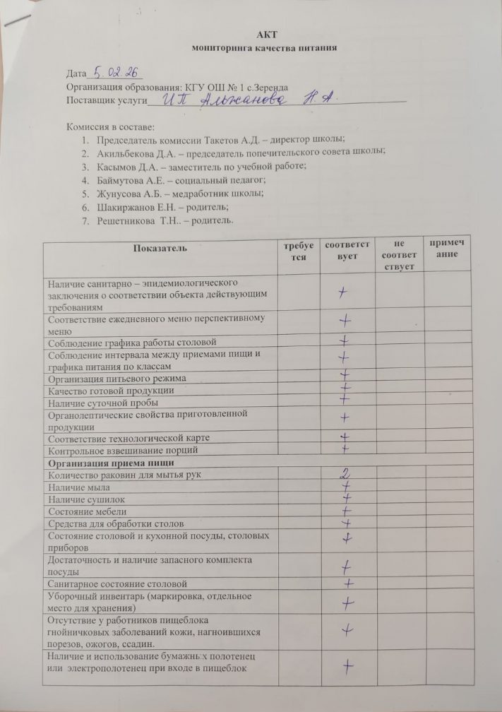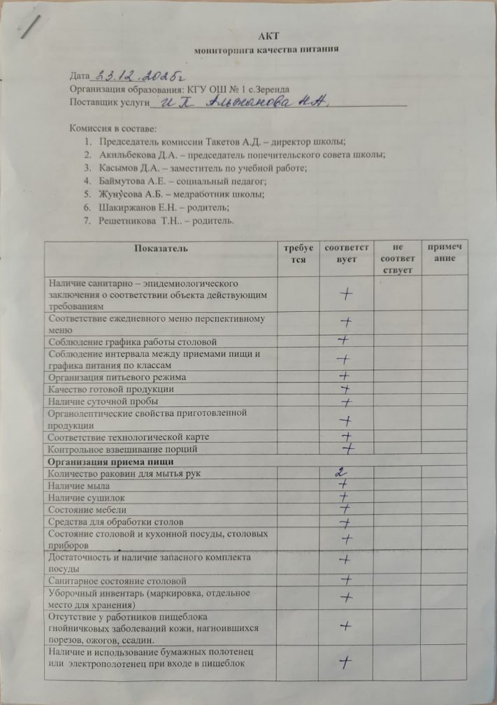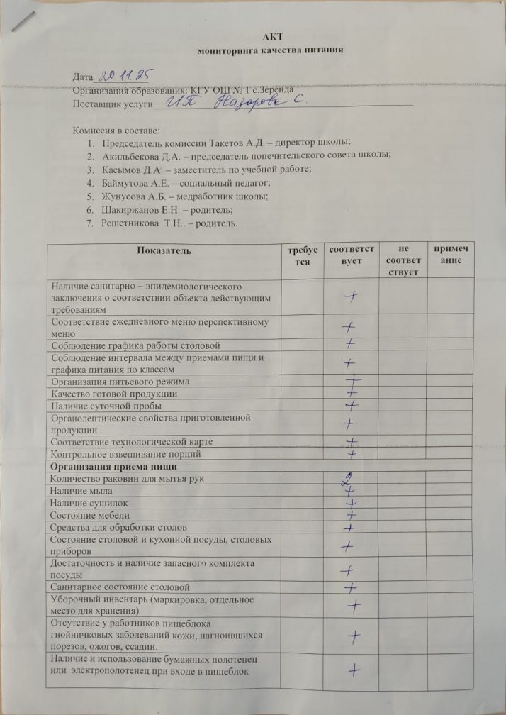 Тамақтану бойынша мониторингтік комиссияның мектеп асханасын тексеру актісі 2025-2026 оқу жылы